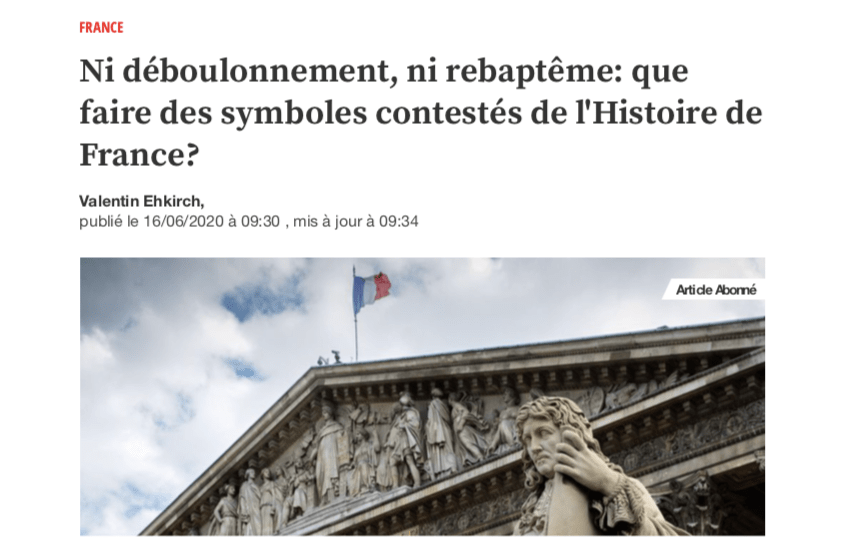 This article was about calls to remove statues that celebrate enslavers and colonizers in France. In the interview, I condemn the idea that removing statues and street names is a form of censorship, and argue that it is the opposite–a truer reading of history.