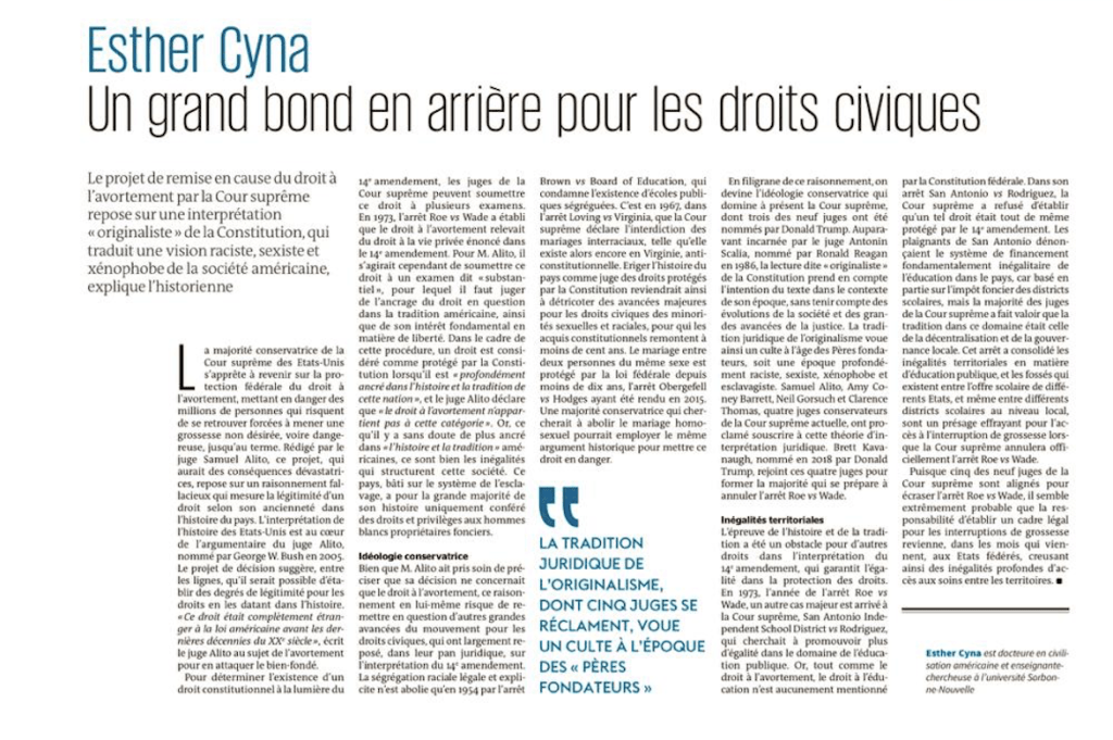 « Le projet de la Cour suprême sur l’avortement risque de remettre en cause d’autres avancées du mouvement pour les droits civiques », Le Monde, 10 mai 2022
